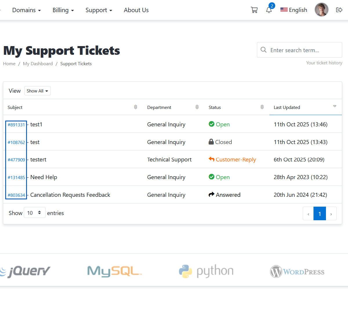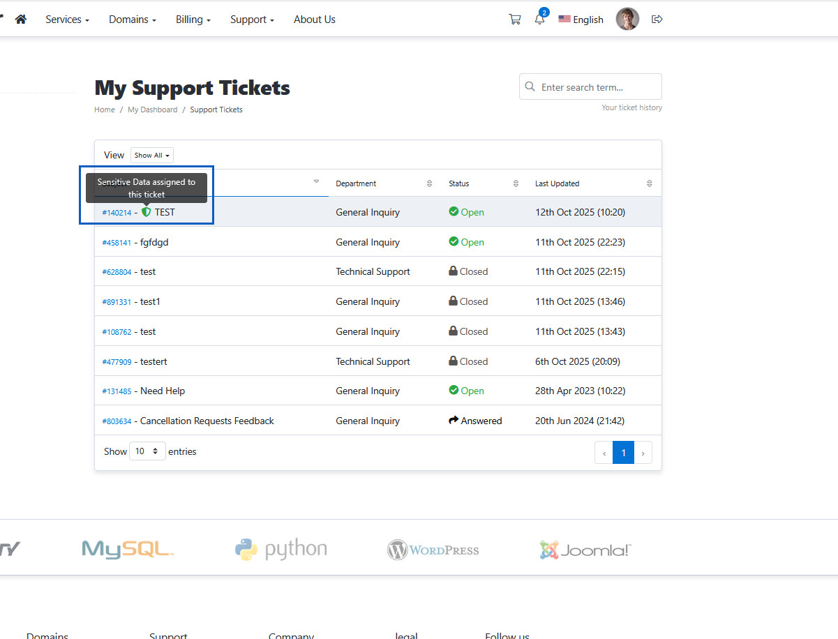 This improvement not only speeds up the interface but also makes it more responsive, especially when handling large datasets. Actions like filtering domain names, sorting ticket entries, or searching for specific invoices become smoother as the data updates dynamically without needing to reload the entire page.
