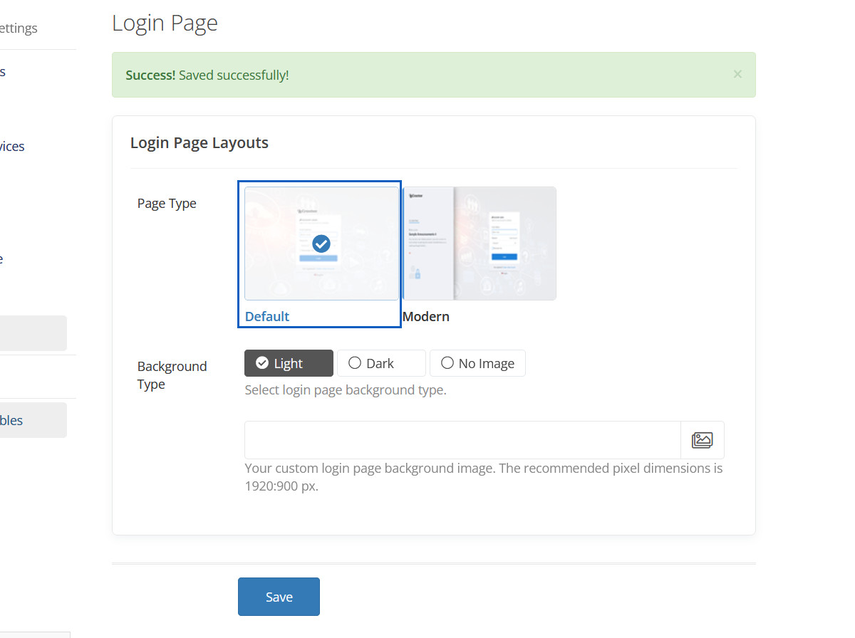 In both layouts, you can enable a banner-style header for the client area, as shown in the screenshot below. Once enabled, you will have the option to choose between 'Default' and 'Primary' styles for the banner background. In the 'Default' background style, you can easily change the header image.