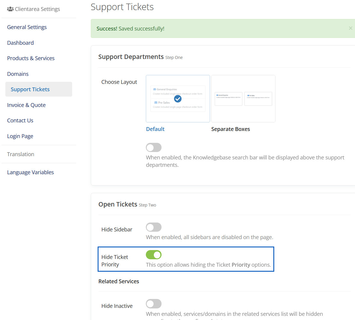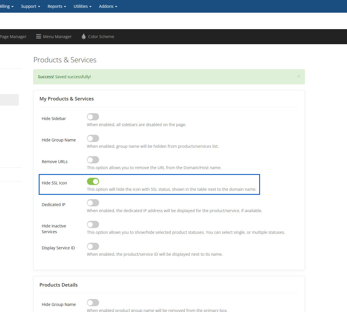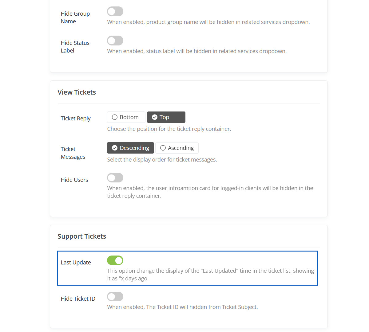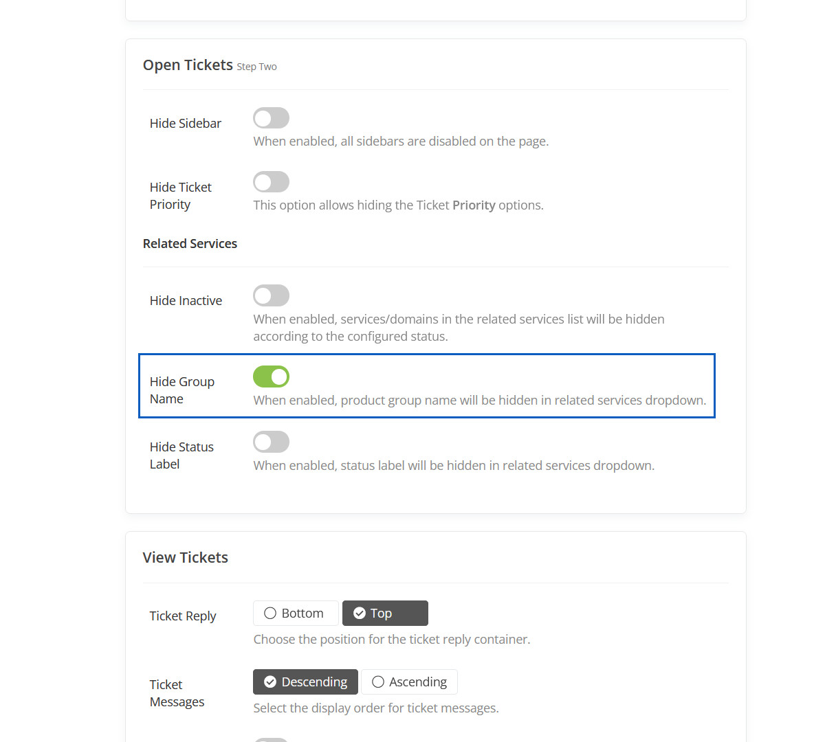 When enabled, It will hide services group name from "Your Active Products/Services" panel