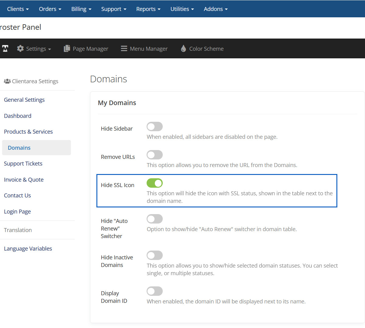 When enabled, this will disable the default 'warning' panels generated by WHMCS for overdue invoices, expiring domains/services, and active alerts at the top of the page.